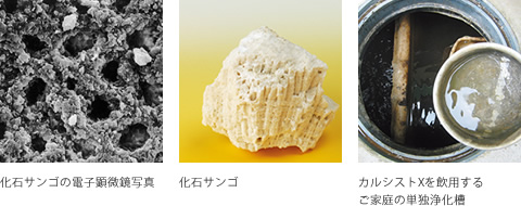 ミクロ未満のレベルまで多孔質というのが、豊富なミネラルを凝縮した化石サンゴのもうひとつの特長です。 その微細な孔は化学物質や重金属、細菌などを吸着する物理的な特性に優れていますので、ろ材として廃液や汚水の処理、土壌の改良など、幅広い産業分野で利用されています。自然の環境下に放出された化石サンゴは、半永久的に浄化作用を繰り返す天然の触媒とも言えるでしょう。
